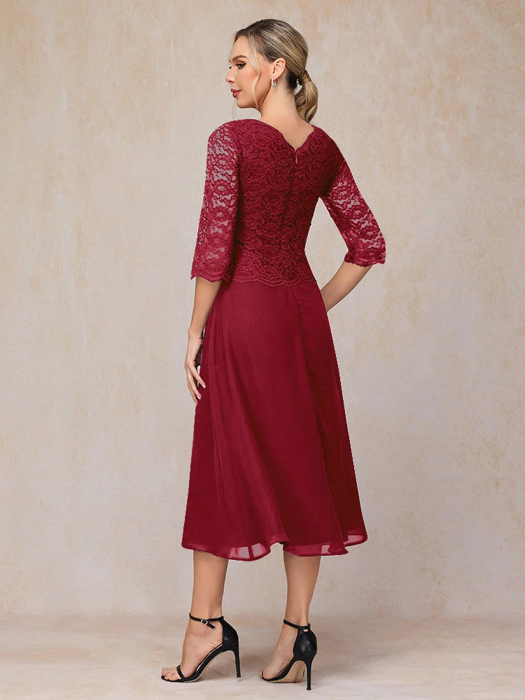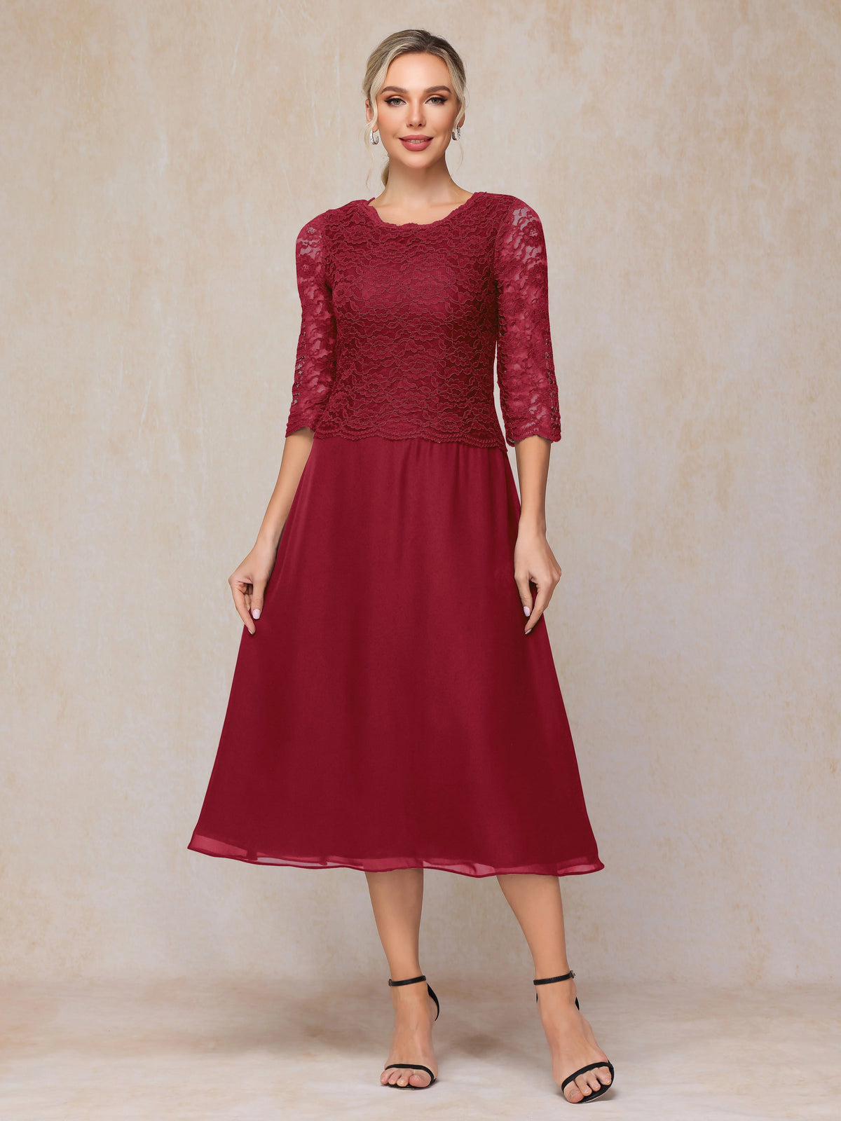 lovely dress features an A line silhouette, offering a flowing and graceful look. The crew neckline exudes charming appeal, while the three quarter sleeves add a touch of elegant refinement. The zipper - back ensures a secure fit, and the midi length skirt, with its delicate lace bodice and soft chiffon skirt, creates a truly charming and unforgettable style, perfect for a mother of the bride at a wedding ceremony.