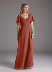 This charming dress features an A - line silhouette, offering a flowing and elegant look. The V neckline exudes alluring charm, while the flutter sleeves add a touch of delicate grace. The zipper back ensures a secure fit, and the floor length skirt, with its pleated detailing on the bodice, creates a truly charming and unforgettable style, perfect for wedding events.
