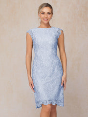 lovely dress features a sheath silhouette, offering a sleek and form fitting look. The boat neckline exudes charming appeal, while the cap sleeves add a touch of delicate elegance. The zipper back ensures a secure fit, and the knee length skirt, crafted from intricate lace with a scalloped hem, creates a truly charming and unforgettable style, perfect for a mother of the bride at a wedding ceremony.
