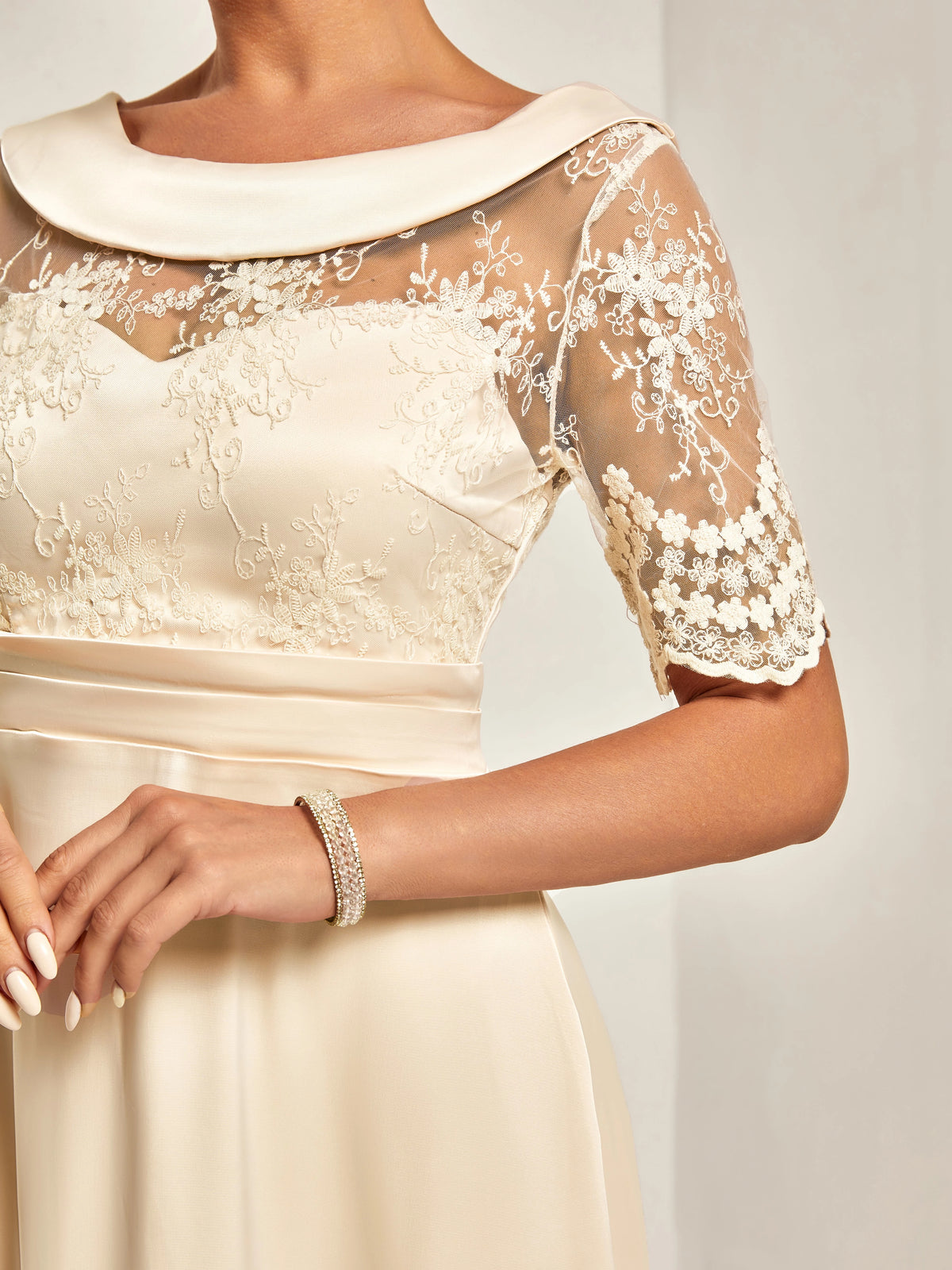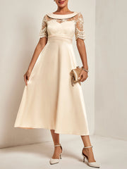 stylish dress features an A line silhouette, offering a graceful and flowing look. The boat neckline exudes chic charm, while the lace short sleeves add a touch of delicate elegance. The V back design adds a hint of alluring sophistication, and the midi length skirt, with its satin fabric and defined waist, creates a truly chic and unforgettable style, perfect for a mother of the bride at a wedding ceremony.