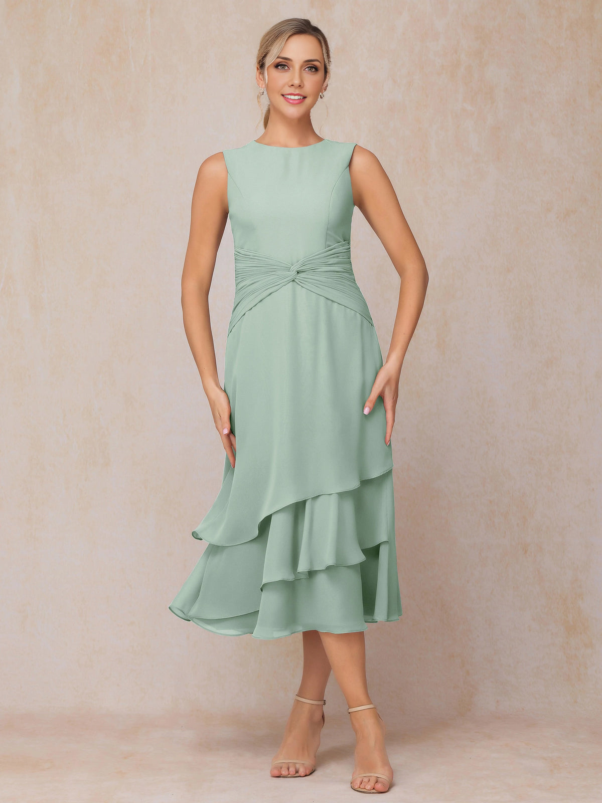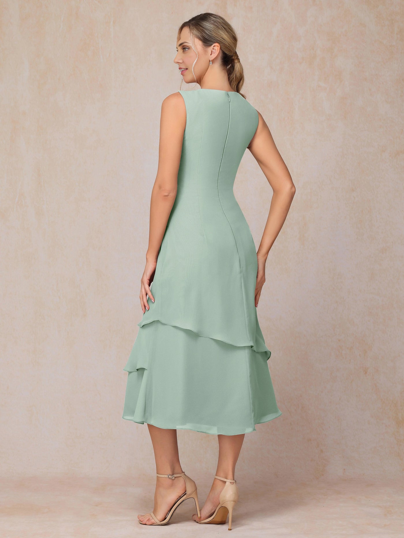 stylish dress features an A line silhouette, offering a flowing and graceful look. The crew neckline exudes chic charm, while the sleeveless design keeps it modern and elegant. The zipper back ensures a secure fit, and the midi - length skirt, with its layered ruffle detailing, creates a truly chic and unforgettable style, perfect for a mother of the bride at a wedding ceremony.