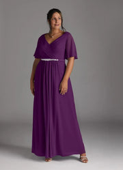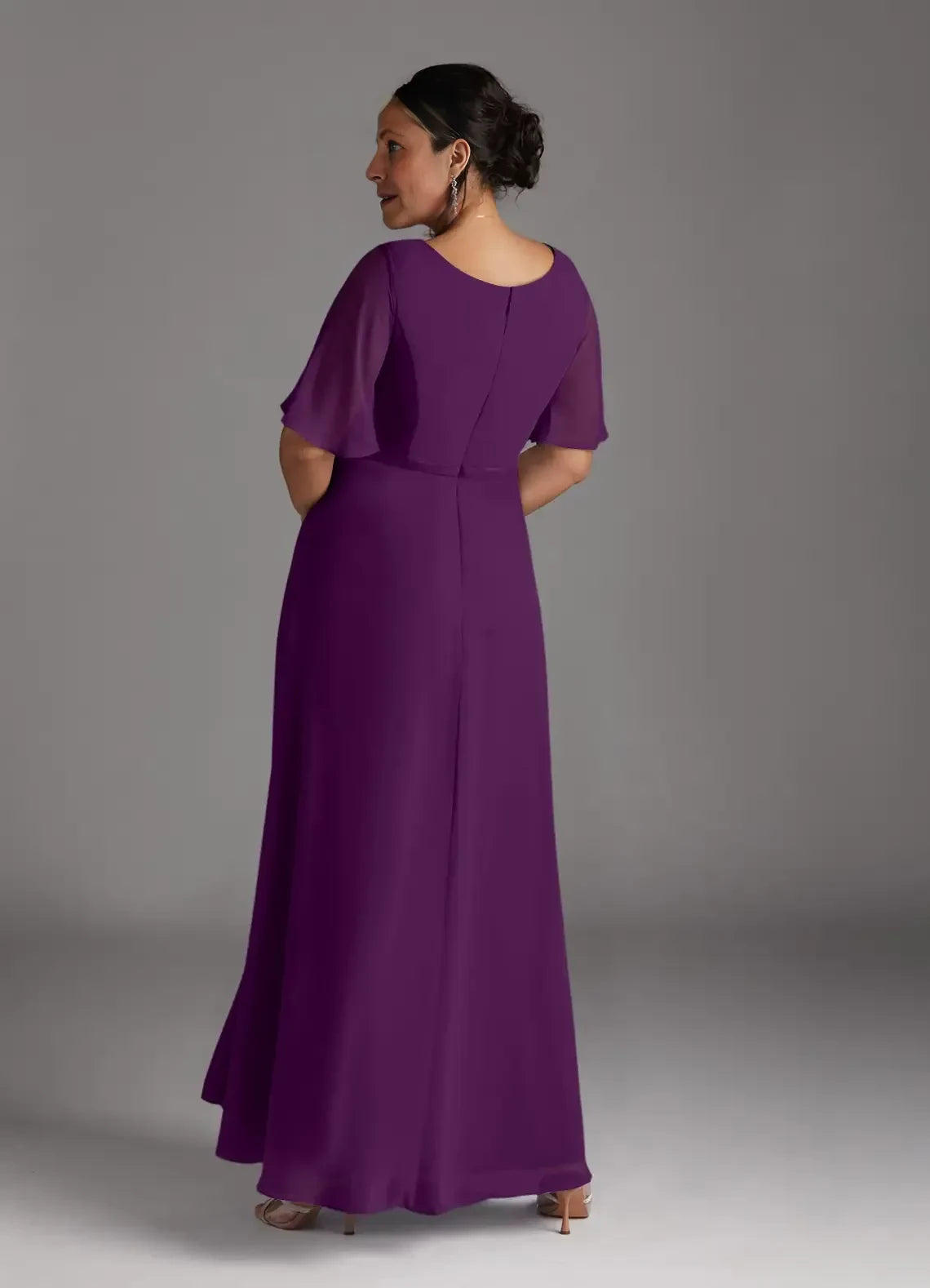 stylish Plus Size dress features an A line silhouette, offering a sleek and modern look. The V neckline exudes chic charm, while the flutter sleeves add a touch of elegant allure. The zip back ensures a secure fit, and the floor length skirt, with its smooth fabric and beaded waist detail, creates a truly chic and unforgettable style, perfect for a mother of the bride at a wedding ceremony.