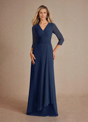 stylish dress features an A line silhouette, offering a sleek and modern look. The V neckline exudes chic charm, while the three quarter chiffon sleeves add a touch of elegant allure. The ruched back ensures a flattering fit, and the floor length skirt, with its smooth fabric and asymmetrical hem detail, creates a truly chic and unforgettable style, perfect for a mother of the bride at a wedding ceremony.
