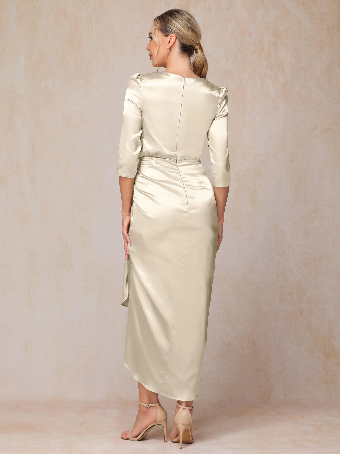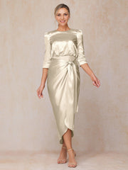 stylish dress features a sheath silhouette, offering a sleek and form fitting look. The crew neckline exudes chic charm, while the three quarter sleeves add a touch of elegant refinement. The zipper back ensures a secure fit, and the midi length skirt, with its satin fabric and knot detail, creates a truly chic and unforgettable style, perfect for a mother of the bride at a wedding ceremony.