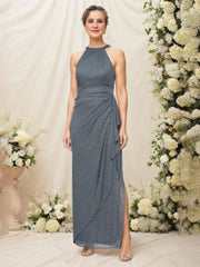 stylish dress features a sheath silhouette, offering a sleek and elegant look. The halter neckline exudes chic charm, while the sleeveless design adds a touch of modern sophistication. The zip back ensures a secure fit, and the floor length skirt, with its shimmering fabric and thigh high slit, creates a truly chic and unforgettable style, perfect for a mother of the bride at a wedding ceremony.