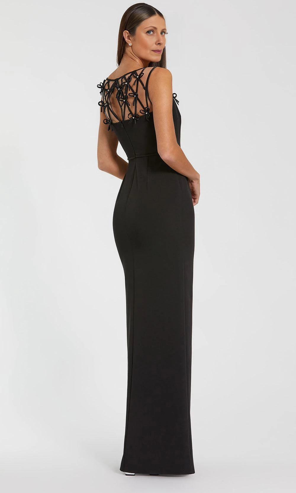 Step into chic sophistication with this sheath dress. It features an illusion neck with delicate bow details for a charming and alluring look, is sleeveless for a sleek feel, and has an open back that adds a touch of elegance. The maxi length makes it perfect for evening occasions, ensuring you look absolutely stunning.