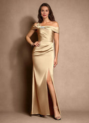 stylish dress features a sheath silhouette, offering a sleek and trendy look. The off shoulder neckline exudes chic charm, while the sleeveless design adds a touch of modern allure. The zipper back ensures a secure fit, and the floor length skirt, with its smooth satin fabric, draped detail, and thigh - high slit, creates a truly chic and unforgettable style, perfect for a mother of the bride at a wedding ceremony.