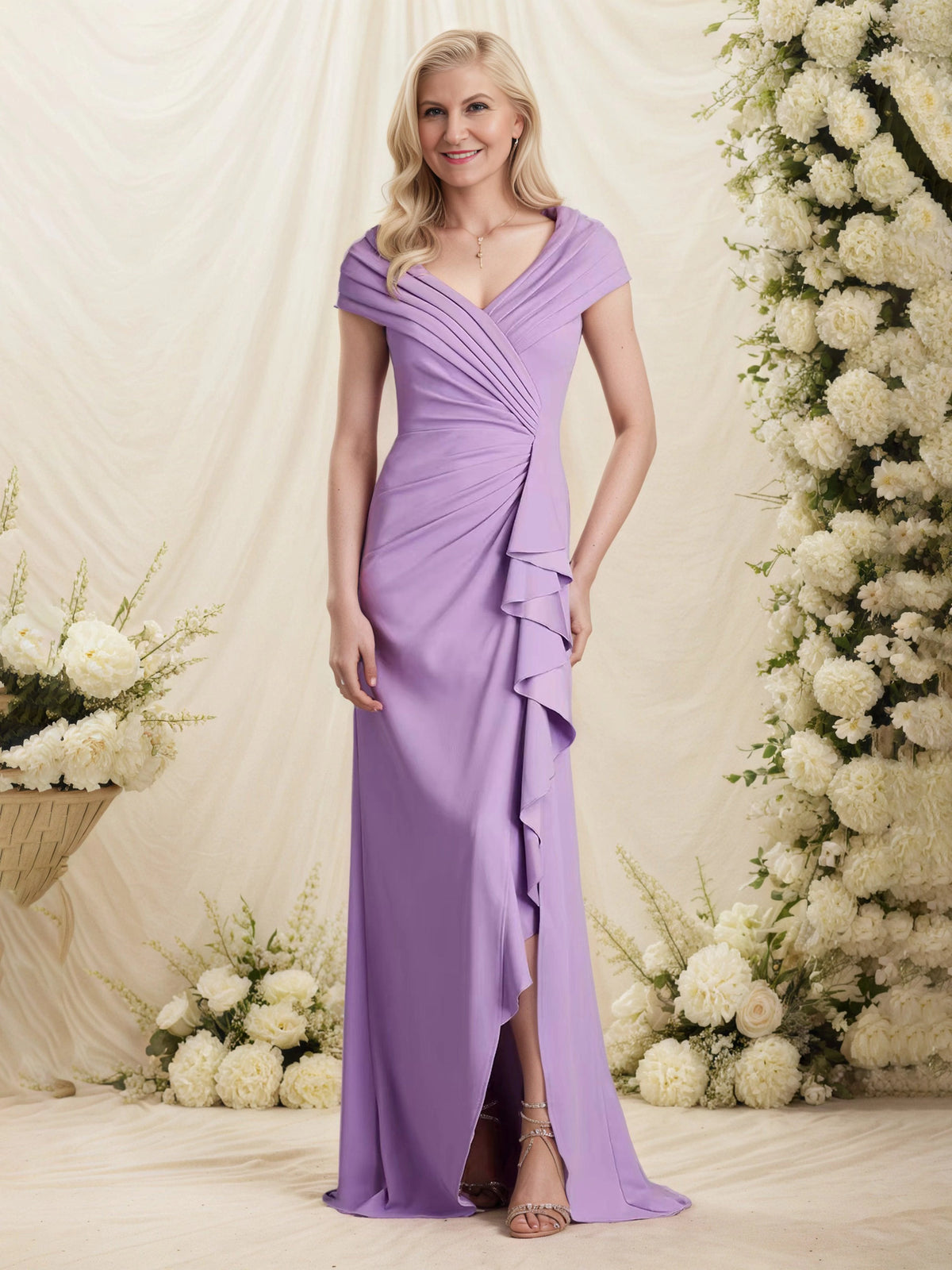 Chic Sheath Surplice Neck Cap Sleeve Zip Back Floor Length Mother of the Bride Dress