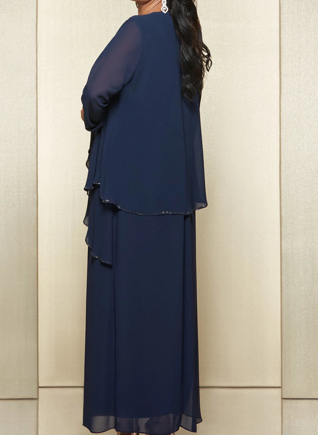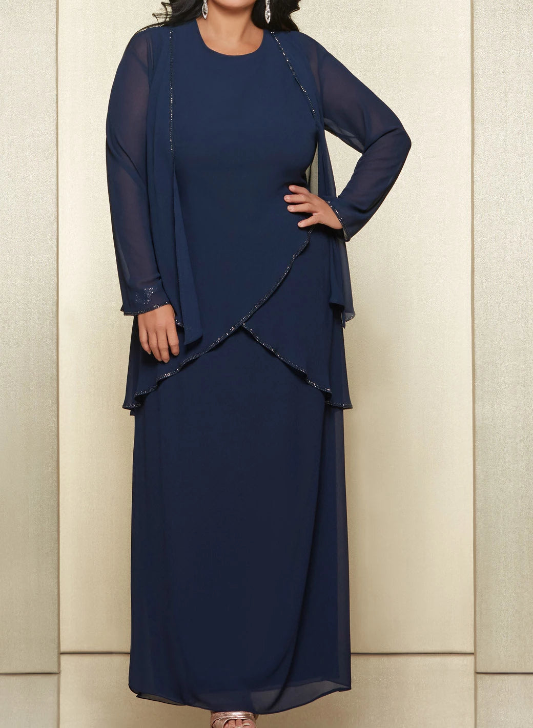 This elegant mother-of-the-bride dress features a floor-length chiffon design with long sleeves and a round neckline, offering a graceful and refined silhouette. The included matching jacket adds versatility and modesty, perfect for formal occasions. Crafted from lightweight chiffon, it ensures comfort while maintaining a sophisticated appearance suitable for memorable events.