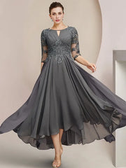 This charcoal gray mother of the bride dress features a flattering scoop neckline and delicate half sleeves crafted from soft chiffon. The tea-length skirt offers an elegant silhouette, while intricate applique details add refined texture and sophistication. Designed for comfort and style, this dress is perfect for formal occasions, ensuring a graceful and polished appearance.