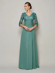 Chiffon V-neck Short Sleeves Floor-Length With Lace Mother of the Bride Dresses