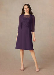 delicate dress set features an A line silhouette for a flowing, graceful look. The illusion neckline offers a touch of refined charm, and the sleeveless design brings sleek simplicity. The zipper back ensures a secure fit, with a knee length skirt adding a modern touch. Paired with a matching chiffon jacket, it creates a stylish and versatile ensemble, perfect for mother of the bride occasions.