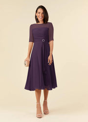 refined dress features an A line silhouette, offering a flowing and graceful look. The boat neckline exudes elegant charm, while the three quarter chiffon sleeves add a touch of delicate allure. The ruched back ensures a flattering fit, and the midi length skirt, with its smooth fabric and ring accentuated waist detail, creates a truly elegant and unforgettable style, perfect for a mother of the bride at a wedding ceremony.