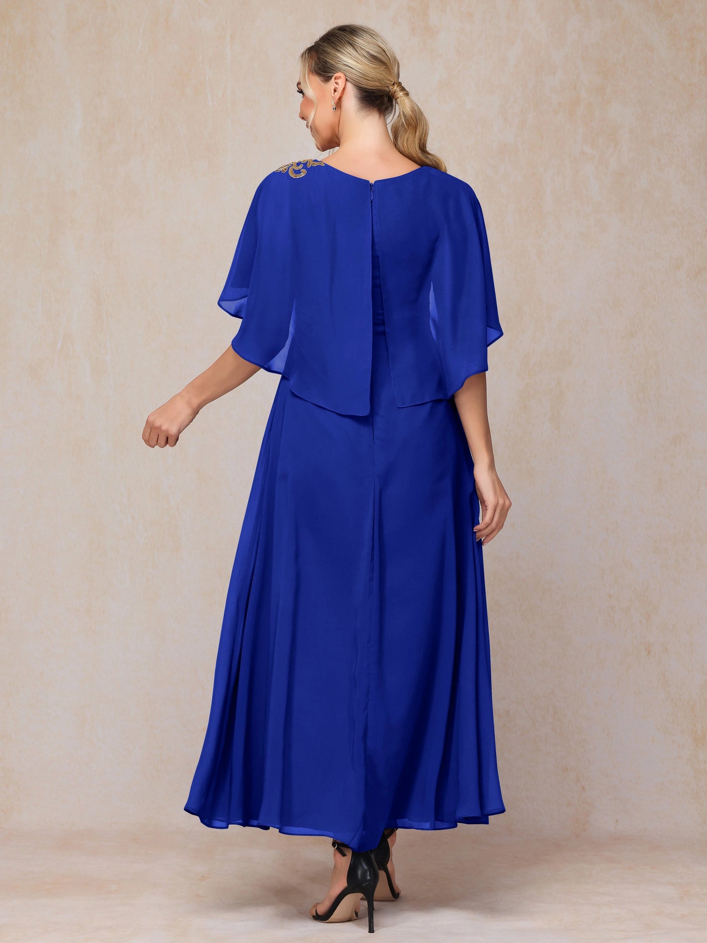 refined dress features an A line silhouette, offering a flowing and graceful look. The crew neckline exudes elegant charm, while the cape sleeves add a touch of dramatic sophistication. The zipper back ensures a secure fit, and the floor length skirt, adorned with a delicate shoulder embellishment, creates a truly elegant and unforgettable style, perfect for a mother of the bride at a wedding ceremony.