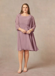 refined set features an A line Plus Size dress with a crew neckline and sleeveless design, offering a classic and graceful look. The zip back ensures a secure fit, and the knee length skirt adds a touch of modern charm. Paired with a matching jacket, it creates a truly elegant and coordinated style, perfect for a mother of the bride at a wedding ceremony.