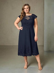 refined dress features an A line silhouette, offering a flowing and graceful look. The illusion neckline exudes elegant charm, while the cap sleeves add a touch of delicate elegance. The open back design adds a hint of sophistication, and the midi length skirt, with its intricate lace detailing, creates a truly elegant and unforgettable style, perfect for a mother of the bride at a wedding ceremony.