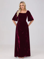 refined dress features an A line silhouette, offering a flowing and graceful look. The square neckline exudes elegant charm, while the flutter sleeves add a touch of delicate movement. The zip back ensures a secure fit, and the floor length skirt, with its luxurious velvet fabric and ruched detailing at the waist, creates a truly elegant and unforgettable style, perfect for a mother of the bride at a wedding ceremony.