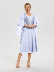 Elegant A Line V Neck Cape Sleeve Zip Back Midi Length Mother of the Bride Dress