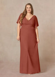 elegant dress boasts an A line silhouette, delivering a flowing and graceful appearance. The V neckline radiates charming allure, while the flutter sleeves bring a touch of delicate refinement. The zipper back ensures a secure fit, and the floor length skirt, along with the pleated detailing on the bodice, crafts a truly elegant and memorable style, ideal for wedding events.