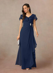 Elegant A Line V Neck Ruffled Sleeve Zip Back Floor Length Mother of the Bride Dress