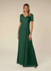 refined dress features an A line silhouette, offering a flowing and graceful look. The V neckline exudes elegant charm, while the short sleeves add a touch of delicate allure. The zipper back ensures a secure fit, and the floor length skirt, with its smooth fabric and draped detail, creates a truly elegant and unforgettable style, perfect for a mother of the bride at a wedding ceremony.