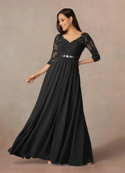 Elegant A Line V Neck Three Quarter Lace Sleeve Zip Back Floor Length Mother of the Bride Dress