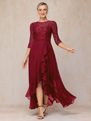 refined dress features a high low A line silhouette, offering a flowing and graceful look with a stylish front to back length variation. The crew neckline exudes elegant charm, while the three quarter sleeves add a touch of vintage sophistication. The tie back allows for a customizable fit, and the skirt, with its delicate lace bodice and ruffled chiffon skirt, creates a truly elegant and unforgettable style, perfect for a mother of the bride at a wedding ceremony.