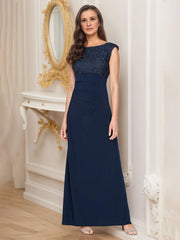 refined dress features a sheath silhouette, offering a sleek and graceful look. The boat neckline exudes elegant charm, while the sleeveless design adds a touch of modern sophistication. The cowl back adds a hint of luxurious allure, and the floor - length skirt, with its lace detailed bodice and smooth fabric, creates a truly elegant and unforgettable style, perfect for a mother of the bride at a wedding ceremony.