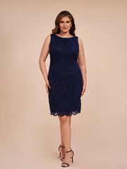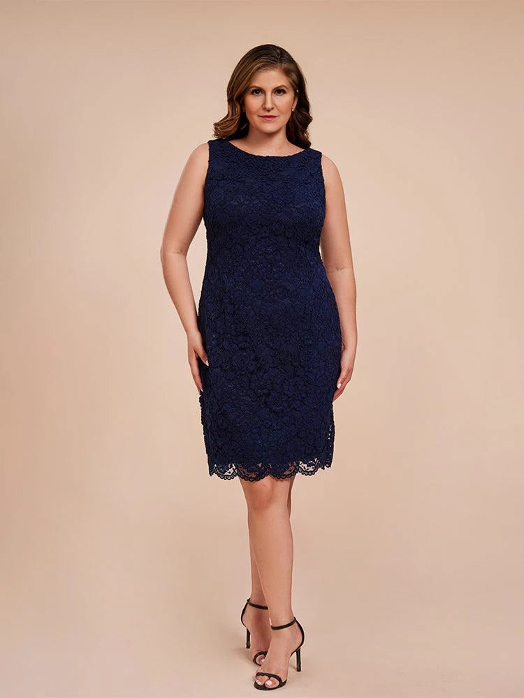refined dress features a sheath silhouette, offering a sleek and form fitting look. The crew neckline exudes elegant charm, while the sleeveless design keeps it modern and chic. The zipper back ensures a secure fit, and the knee length skirt, crafted from delicate lace with intricate detailing, creates a truly elegant and unforgettable style, perfect for a mother of the bride at a wedding ceremony.