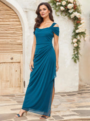 refined dress features a sheath silhouette, offering a sleek and graceful look. The off shoulder neckline exudes elegant charm, while the cold shoulder design adds a touch of alluring sophistication. The ruched back ensures a flattering fit, and the floor length skirt, with its draped detailing and side slit, creates a truly elegant and unforgettable style, perfect for a mother of the bride at a wedding ceremony.