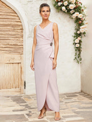 refined dress features a sheath silhouette, offering a sleek and graceful look. The V neckline exudes elegant charm, while the sleeveless design adds a touch of modern sophistication. The zip back ensures a secure fit, and the floor length skirt, with its draped detailing and beaded accent, creates a truly elegant and unforgettable style, perfect for a mother of the bride at a wedding ceremony.