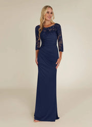 refined dress features a trumpet silhouette, offering a sleek and graceful look. The boat neckline, paired with intricate lace detailing on the bodice and three quarter sleeves, exudes elegant charm. The zip back ensures a secure fit, and the floor length skirt, with its smooth fabric and ruched side detail, creates a truly elegant and unforgettable style, perfect for a mother of the bride at a wedding ceremony.