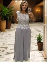 This floor-length A-line mother of the bride dress combines delicate chiffon and intricate lace for an elegant silhouette. Featuring a flattering scoop neckline and sleeveless design, it offers both comfort and sophistication. The flowing chiffon skirt enhances graceful movement, making it an ideal choice for a memorable wedding day.