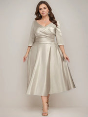 Formal Satin A-Line V-Neck Tea-Length Long Sleeves Ruched Mother of the Bride Dresse