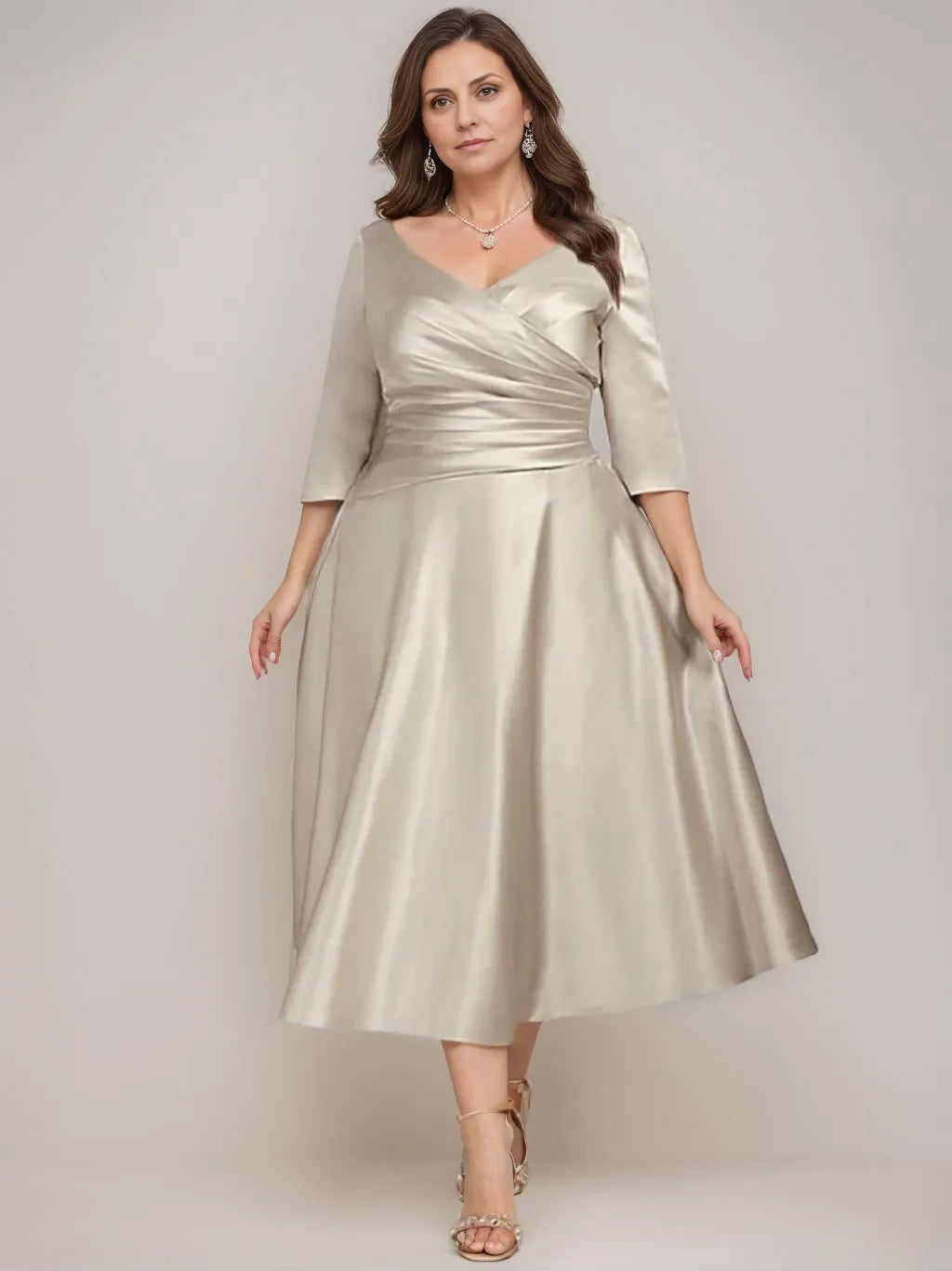 This elegant mother of the bride dress features a refined satin fabric with a flattering A-line silhouette. The V-neck design and ruched detailing enhance the figure, while the tea-length cut and long sleeves offer a sophisticated, timeless look. Ideal for formal occasions, this dress combines classic style with comfortable wearability.