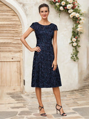 dazzling dress features a sheath silhouette, offering a sleek and form fitting look. The boat neckline exudes glamorous charm, while the cap sleeves add a touch of delicate coverage. The V back design adds a hint of alluring sophistication, and the knee length skirt, adorned with intricate sequin and floral detailing, creates a truly glamorous and unforgettable style, perfect for a mother of the bride at a wedding ceremony.