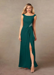 glamorous dress features a sheath silhouette, offering a sleek and figure hugging look. The boat neckline exudes classic elegance, while the sleeveless design adds a touch of sophistication. The zipper back ensures a secure fit, and the floor length skirt with a slit and intricate draping, along with the sparkling embellishment, creates a truly glamorous and unforgettable style, perfect for mother of the bride occasions.