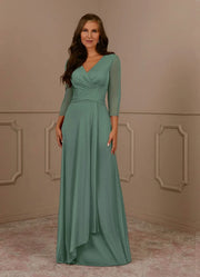 Elegant A Line V Neck Three Quarter Chiffon Sleeve Ruched Back Floor Length Mother of the Bride Dress