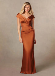 dazzling dress features a trumpet silhouette, offering a sleek and elegant look. The off the shoulder neckline exudes glamorous charm, while the sleeveless design adds a touch of delicate allure. The zip back ensures a secure fit, and the floor length skirt, with its smooth fabric, draped detail at the bodice, and back slit, creates a truly glamorous and unforgettable style, perfect for a mother of the bride at a wedding ceremony.