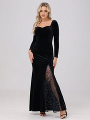 stunning dress features a trumpet silhouette, offering a sleek and figure hugging look that flares at the bottom. The sweetheart neckline exudes glamorous charm, while the long sleeves add a touch of elegant warmth. The open back design adds a hint of sophistication, and the floor length skirt, with its luxurious velvet fabric and sequined lace side slit, creates a truly glamorous and unforgettable style, perfect for a mother of the bride at a wedding ceremony.