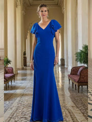Glamorous Trumpet V Neck Ruffle Sleeve Button Back Floor Length Mother of the Bride Dress