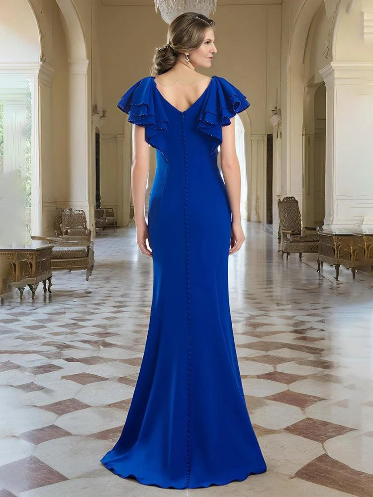 stunning dress features a trumpet silhouette, offering a sleek and form fitting look that flares at the bottom. The V neckline exudes glamorous charm, while the ruffle sleeves add a touch of dramatic elegance. The button back adds a refined detail, and the floor length skirt, with its smooth fabric and elegant drape, creates a truly glamorous and unforgettable style, perfect for a mother of the bride at a wedding ceremony.