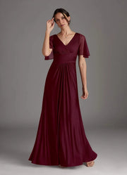 gorgeous dress features an A line silhouette, offering a flowing and elegant look. The V neckline exudes alluring charm, while the chiffon flutter sleeves add a touch of delicate movement. The ruched back provides a stylish and figure - flattering detail, and the floor length skirt, with its pleated bodice, creates a truly gorgeous and unforgettable style, perfect for mother of the bride occasions.