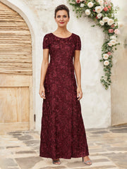 beautiful dress features a sheath silhouette, offering a sleek and elegant look. The jewel neckline exudes gorgeous charm, while the short sleeves add a touch of delicate coverage. The zip back ensures a secure fit, and the floor length skirt, adorned with intricate lace and subtle sequins, creates a truly gorgeous and unforgettable style, perfect for a mother of the bride at a wedding ceremony.