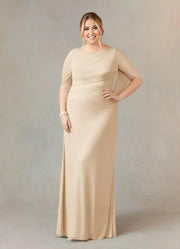 refined Size Floor dress features a trumpet silhouette, offering a sleek and elegant look. The boat neckline exudes graceful charm, while the draped sleeves add a touch of soft allure. The zip back ensures a secure fit, and the floor length skirt, with its smooth fabric and draped back detail, creates a truly graceful and unforgettable style, perfect for a mother of the bride at a wedding ceremony.