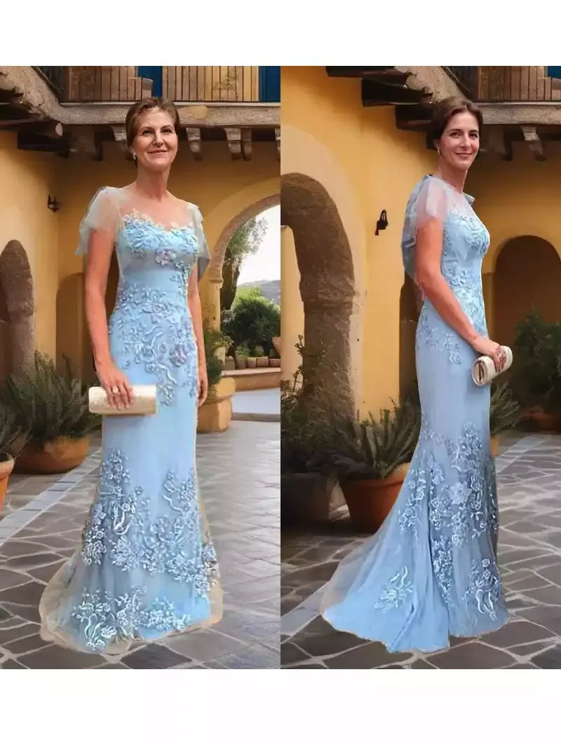This elegant mother of the bride dress features a delicate sheer tulle fabric with a flattering sheath silhouette. The short sleeves and intricate applique detailing add refined sophistication, while the sweep train offers graceful movement. Designed to provide comfort and style, this dress is perfect for celebrating your special day with timeless elegance.