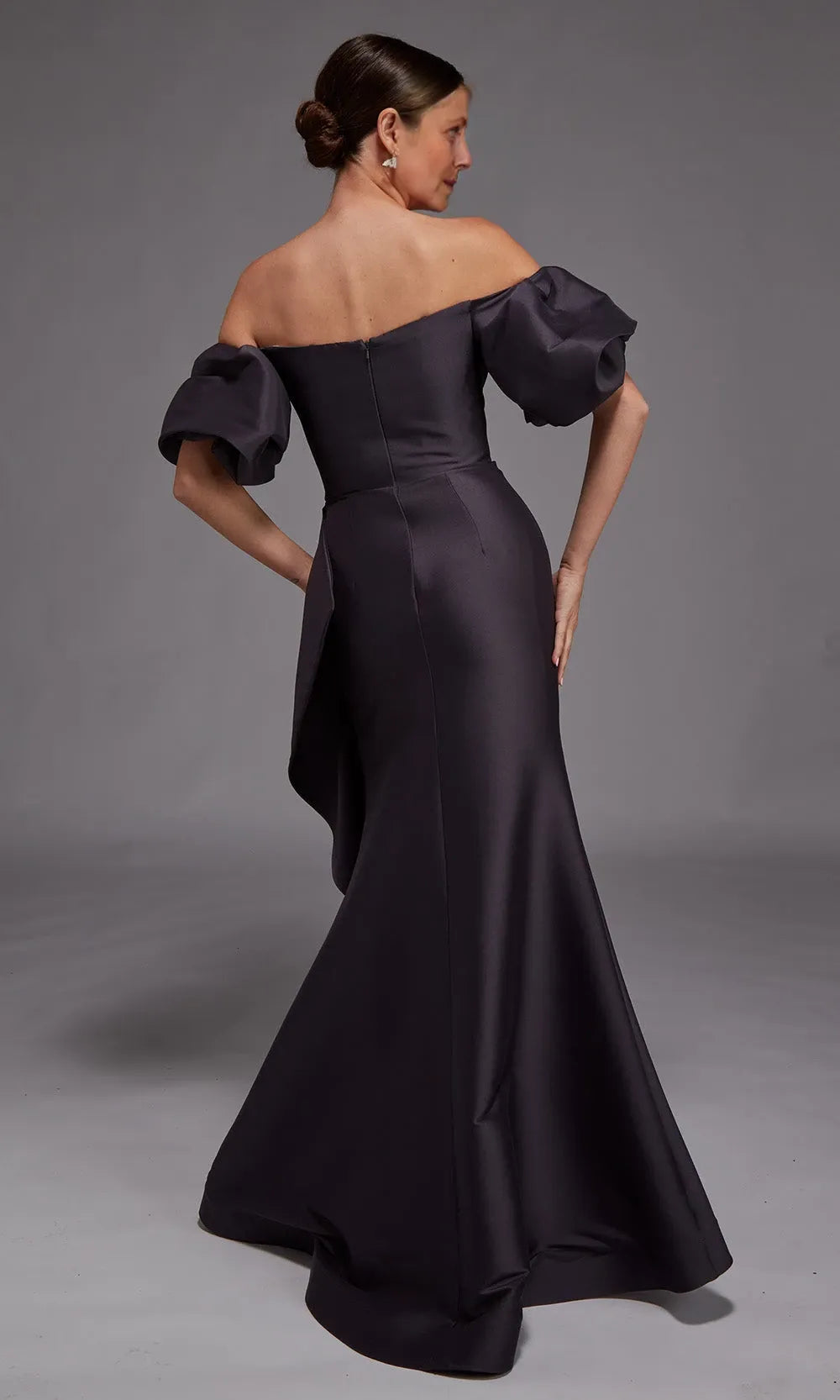 custom off-the-shoulder mother of the bride dress features elegant short sleeves and a floor-length A-line silhouette. Mid open back.Designed for formal occasions, it offers a timeless and flattering fit that complements a range of body types. Tailored to individual measurements, this dress ensures a polished and comfortable look perfect for female guests seeking understated sophistication on the special day.