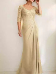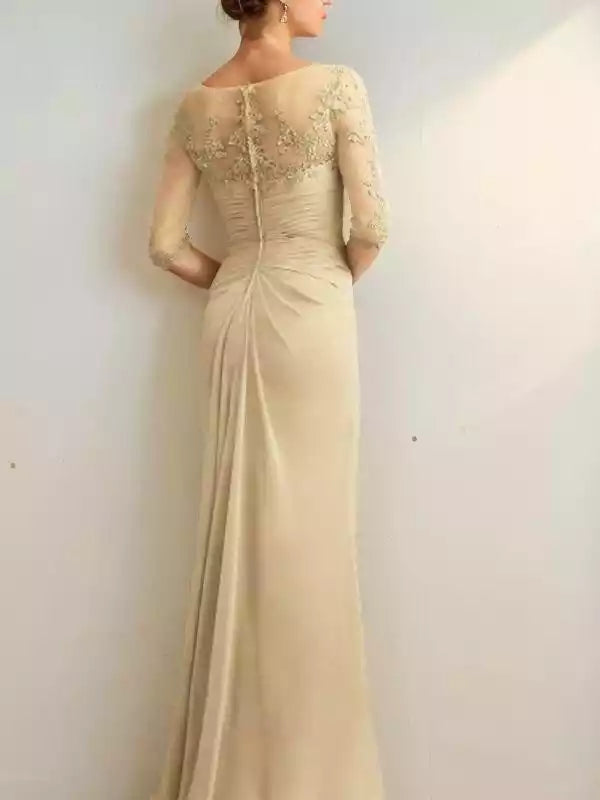 Ruched V-neck 1/2 Sleeves Floor-Length Sheath Chiffon Applique Mother of the Bride Dresses