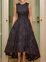 This elegant mother of the bride dress features a flattering A-line silhouette with delicate lace detailing and a sleeveless design for comfort and style. The scoop neckline and asymmetrical hem add a modern touch, making it a sophisticated choice for special occasions. Crafted to provide both grace and ease of movement, this dress ensures a polished and timeless look.