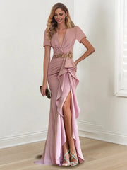 Satin Mermaid Floor-Length V Neck with Ruffles Short Sleeves Split Side Mother of the Bride Dresses